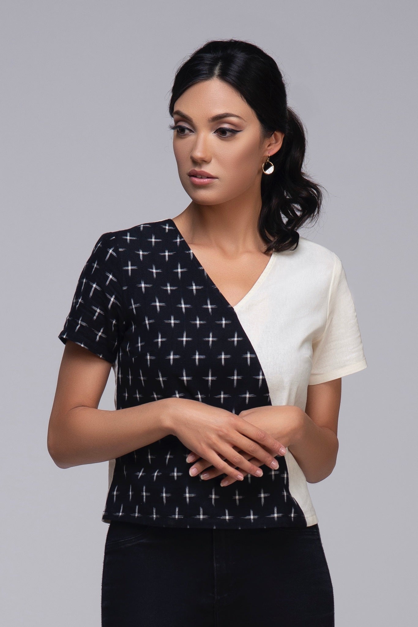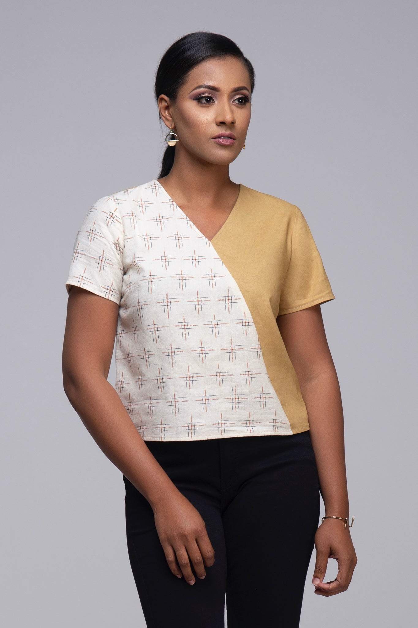 The ‘Elora’ captures the art of casual-cool. Made from soft ikat cotton and linen, this color block top is perfect for warm weather. Wear this versatile top to the office, brunch, or dress it up with the 'Mika' ikat or linen pant to create the perfect jumpsuit for a night out.