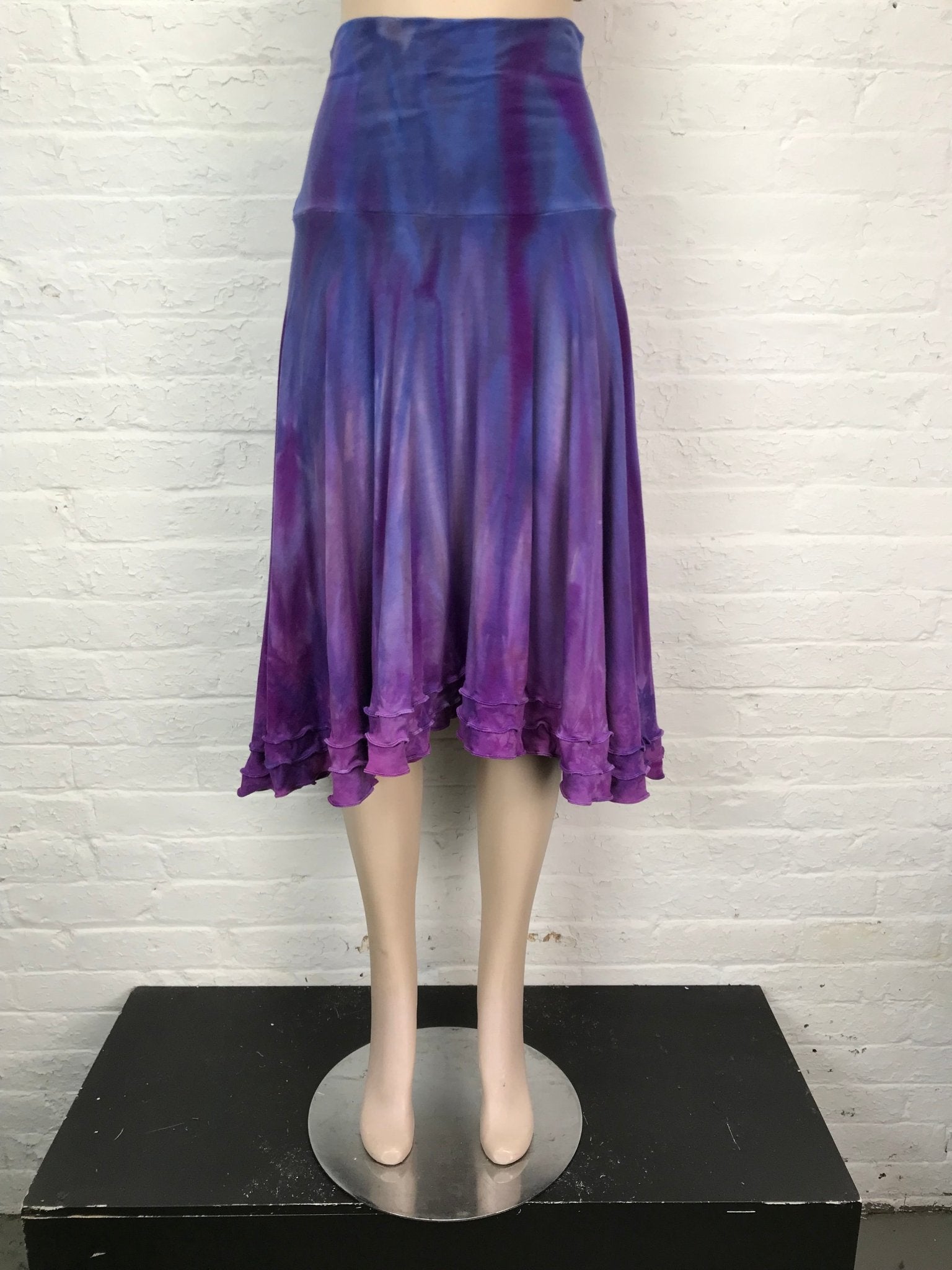 Each skirt is individually hand-dyed by the artist using layered ombre and resist techniques, creating a rich gradient that shifts from deep violet to soft orchid. No two are ever alike—your skirt will be completely one of a kind.