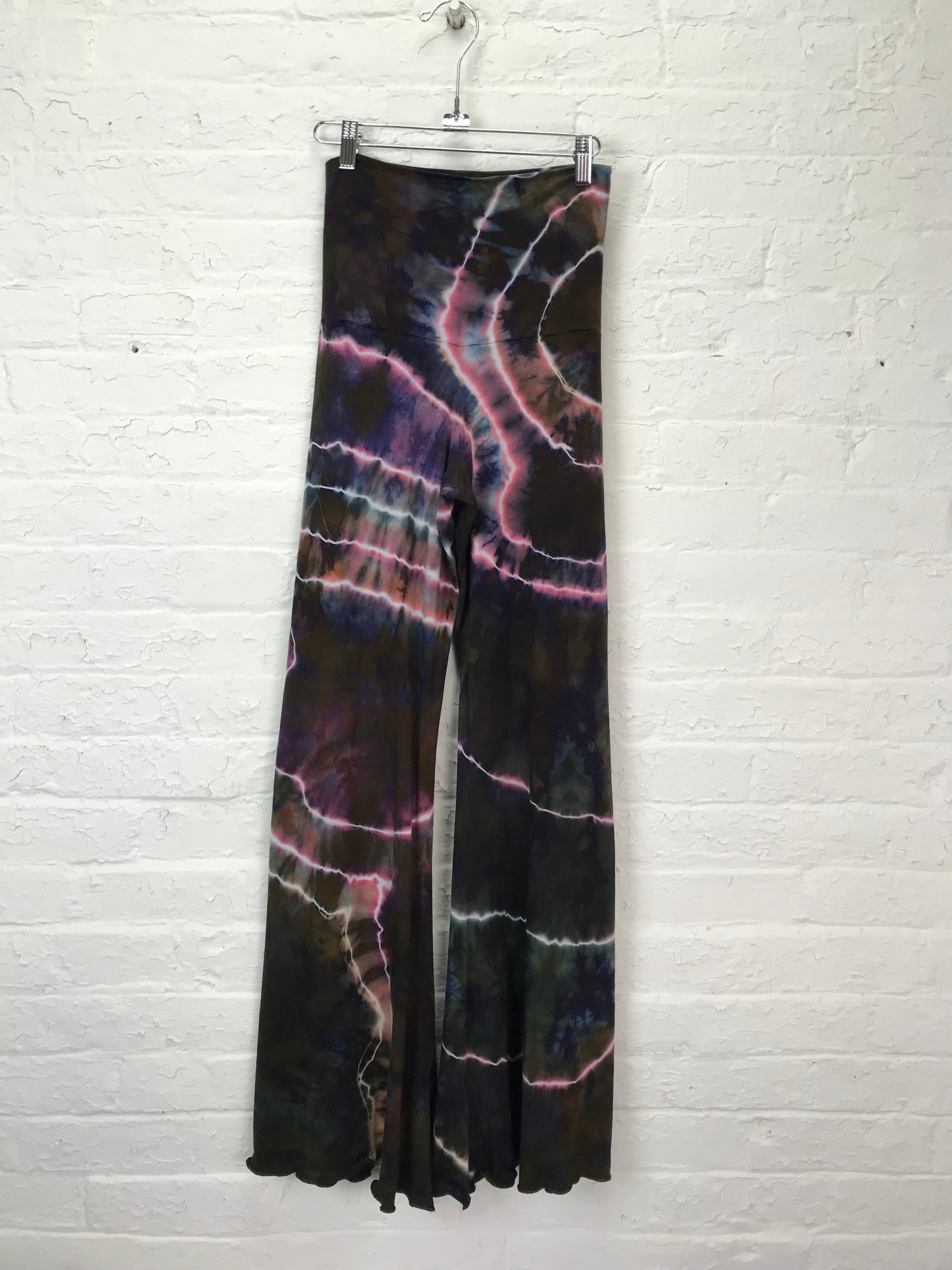 The wide leg Spanish Pant has a tall wide waistband that can be folded over.  The fit is looser than the legging.