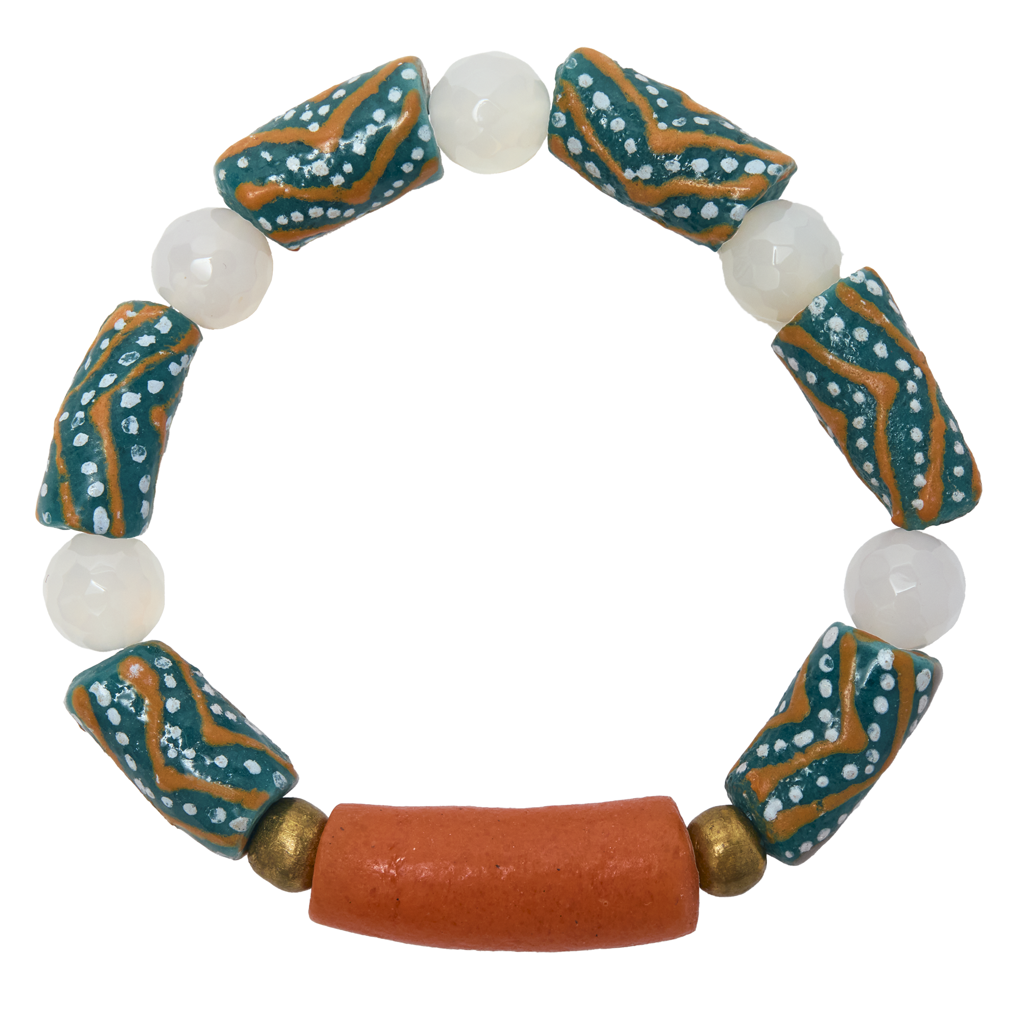 The Bibi bracelet is colorful, fun, and full of personality. A bold orange African recycled glass tube bead anchors faceted natural agate and dotted teal, orange, and white recycled glass beads. Playful yet polished, Bibi adds vibrant energy to any look.