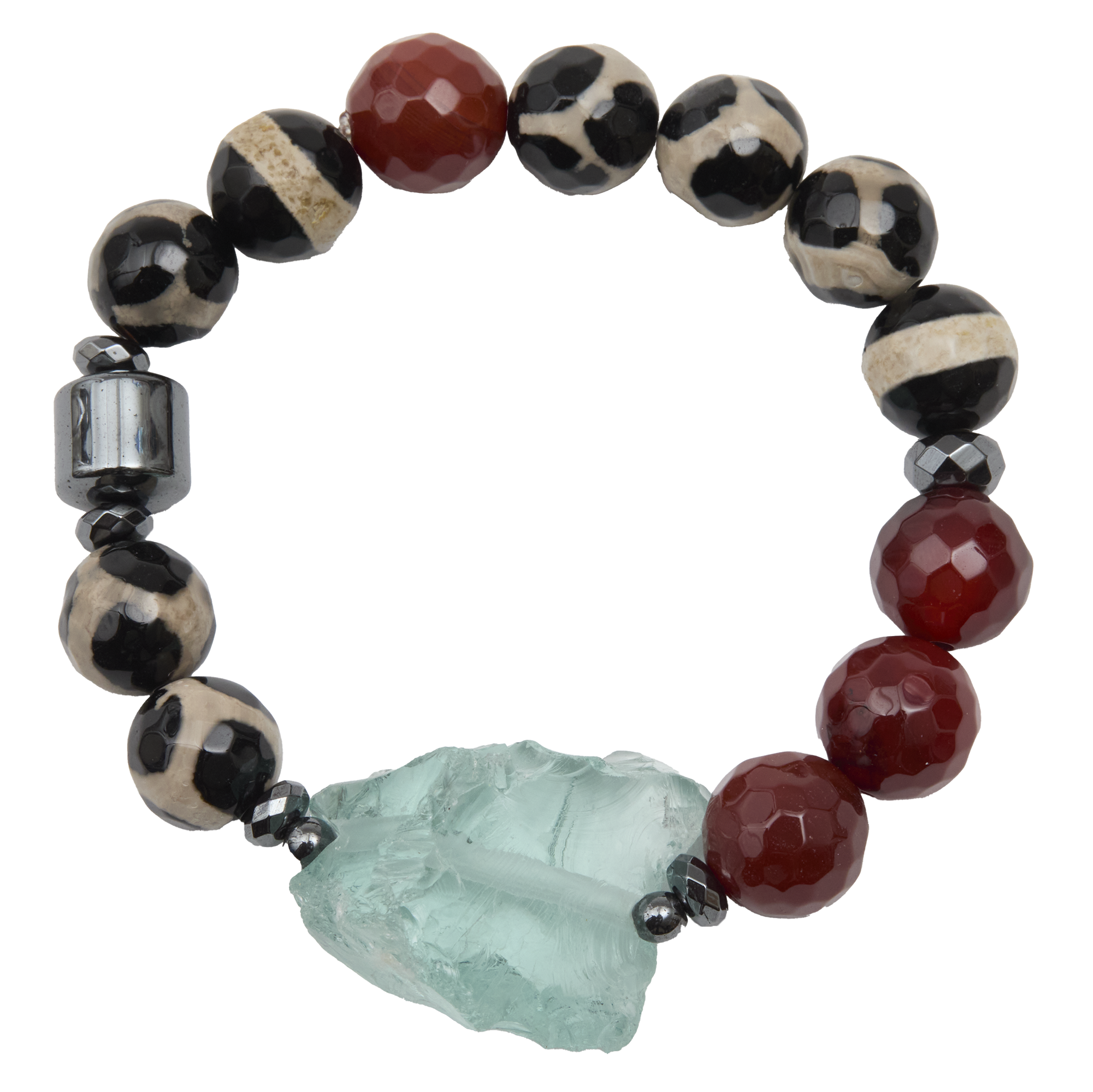 The Cameron bracelet is bold, unique, and undeniably one of a kind. Mixed Tibetan agate beads are paired with carnelian and hematite, all anchored by a raw quartz chunk focal. Striking in texture and design, Cameron is made to stand out with confident energy.