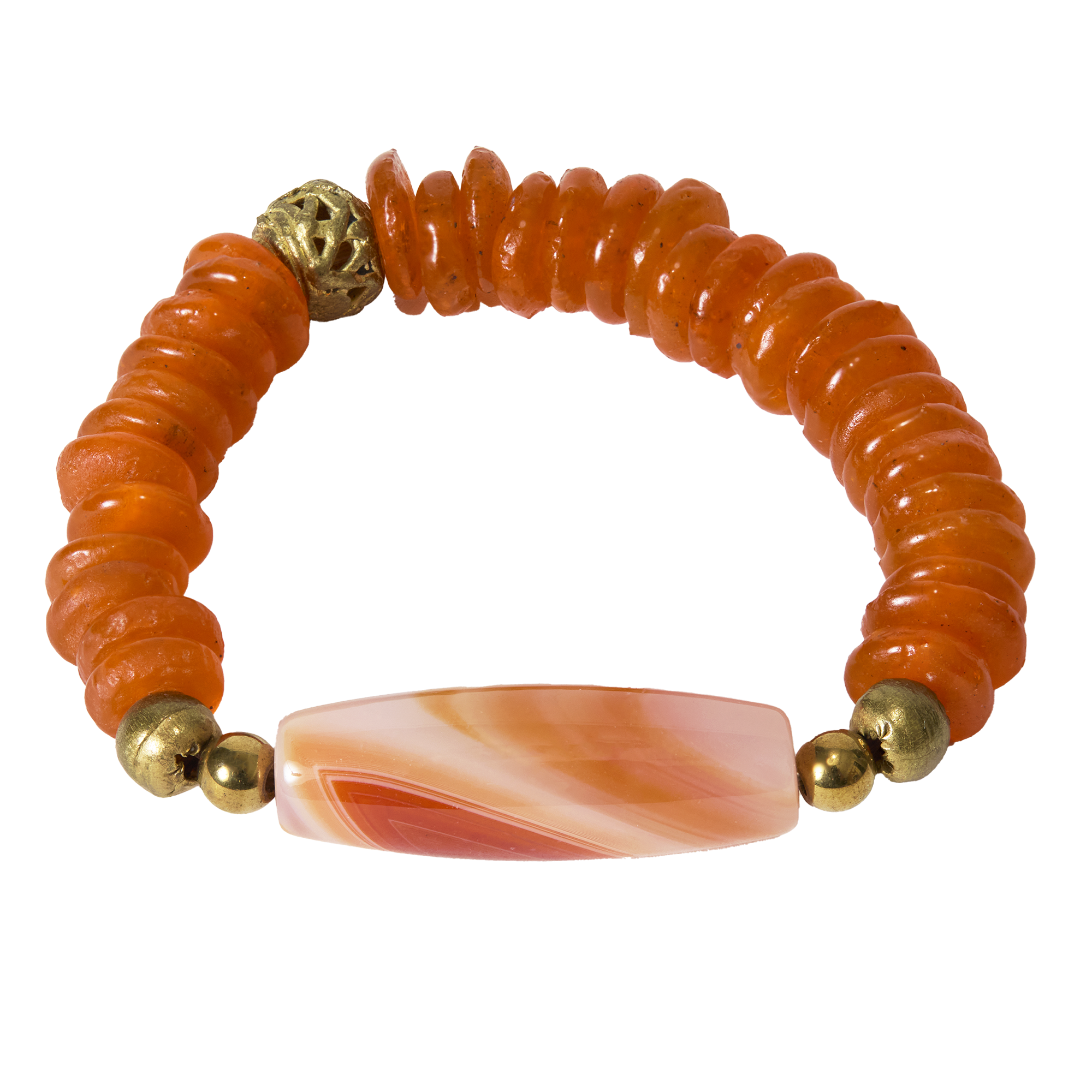 The Issa bracelet is bright, bold, and one of a kind. An orange banded agate focal is paired with luminous orange vaseline beads and finished with brass accents for a look that’s vibrant yet refined. Distinctive and full of character, Issa is made to stand out.