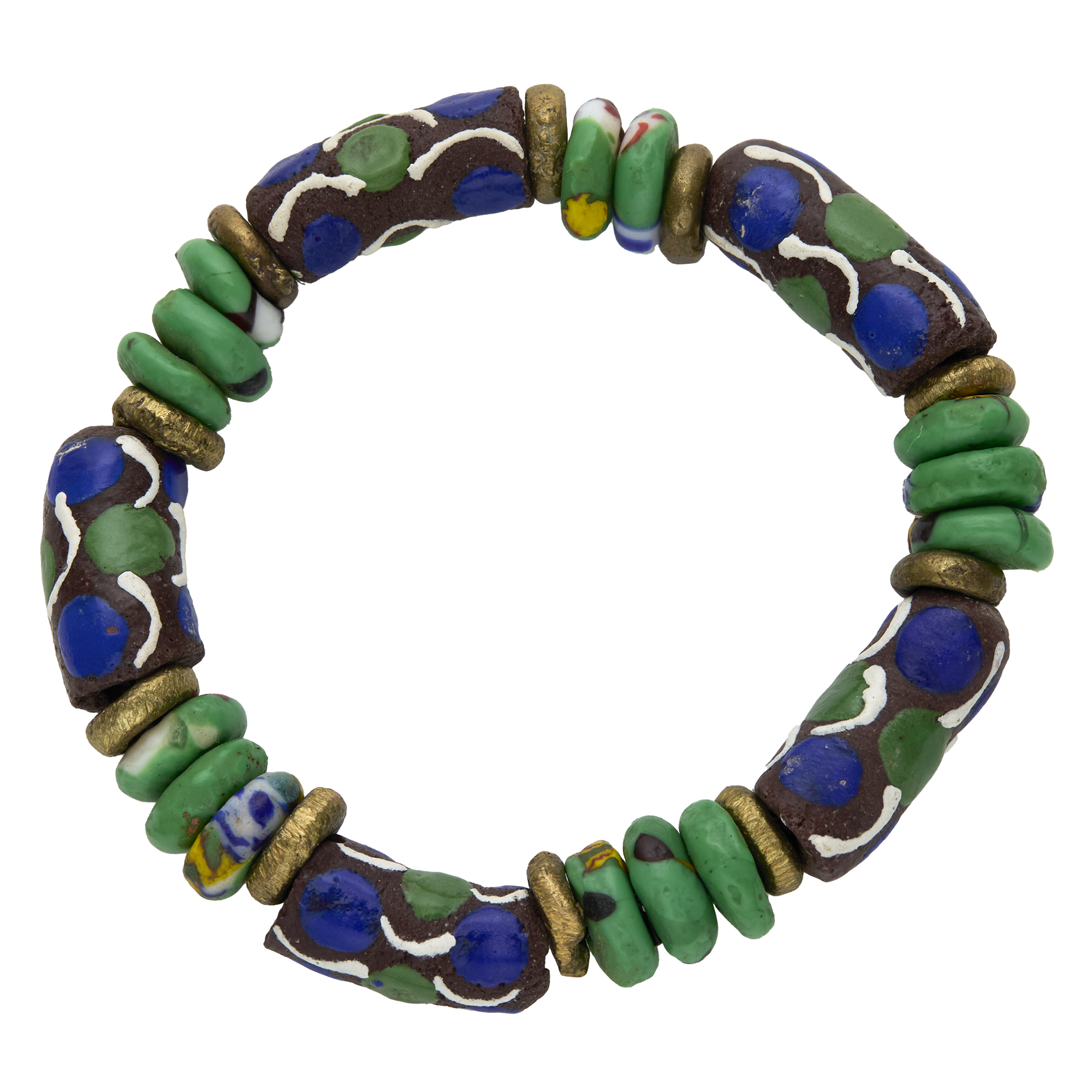The Khalil bracelet is dynamic and layered, designed with depth and movement. Brown, blue, green, and white Krobo beads are paired with green fused rondelles and finished with brass donut accents for balance and shine. Bold yet versatile, Khalil brings vibrant energy to your style.
