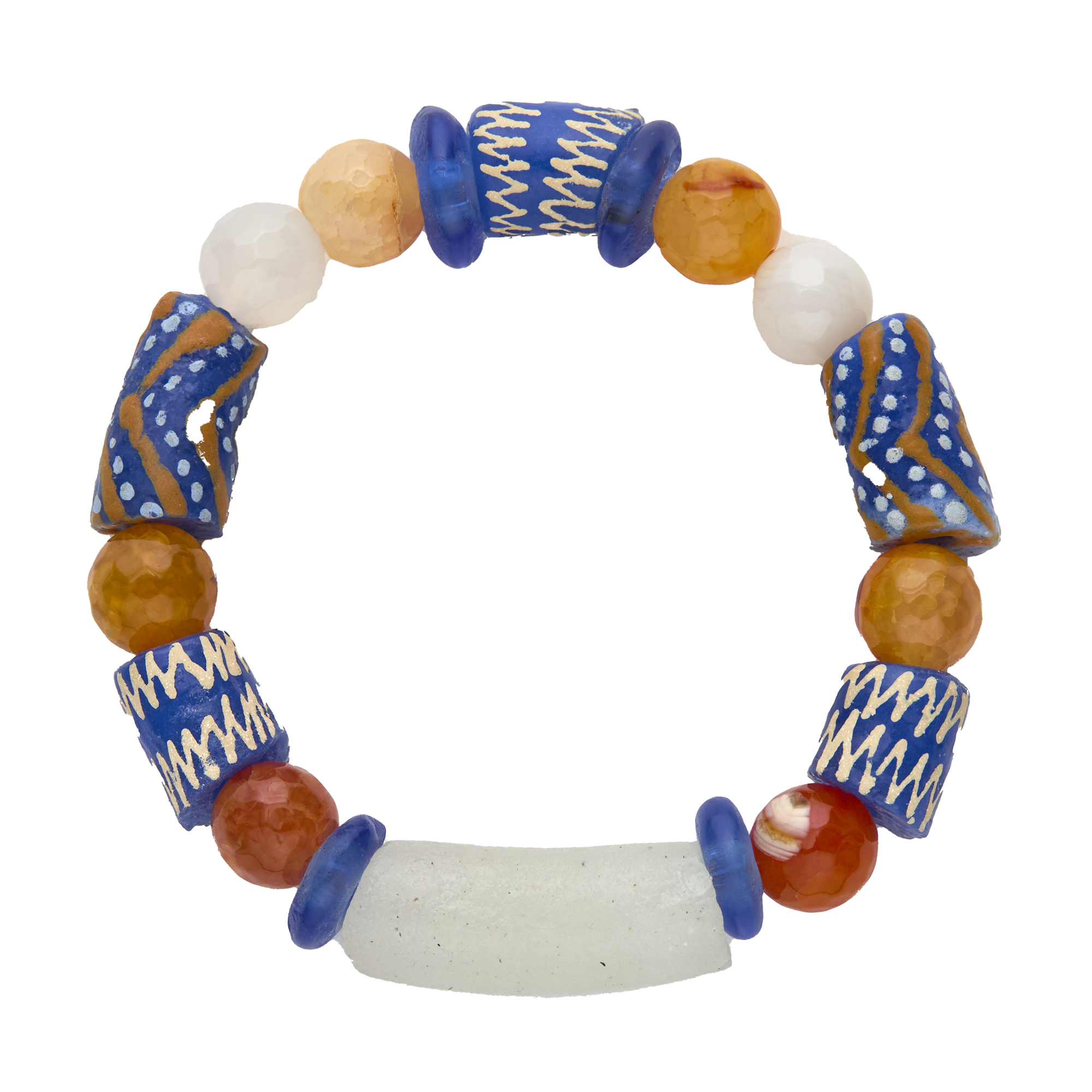 The Kimi bracelet is bold, textured, and full of character. Blue and white African recycled glass Krobo beads pair with natural and dyed orange agate for striking contrast and dimension. Vibrant yet refined, Kimi captures the fearless spirit of Afro Luxe.