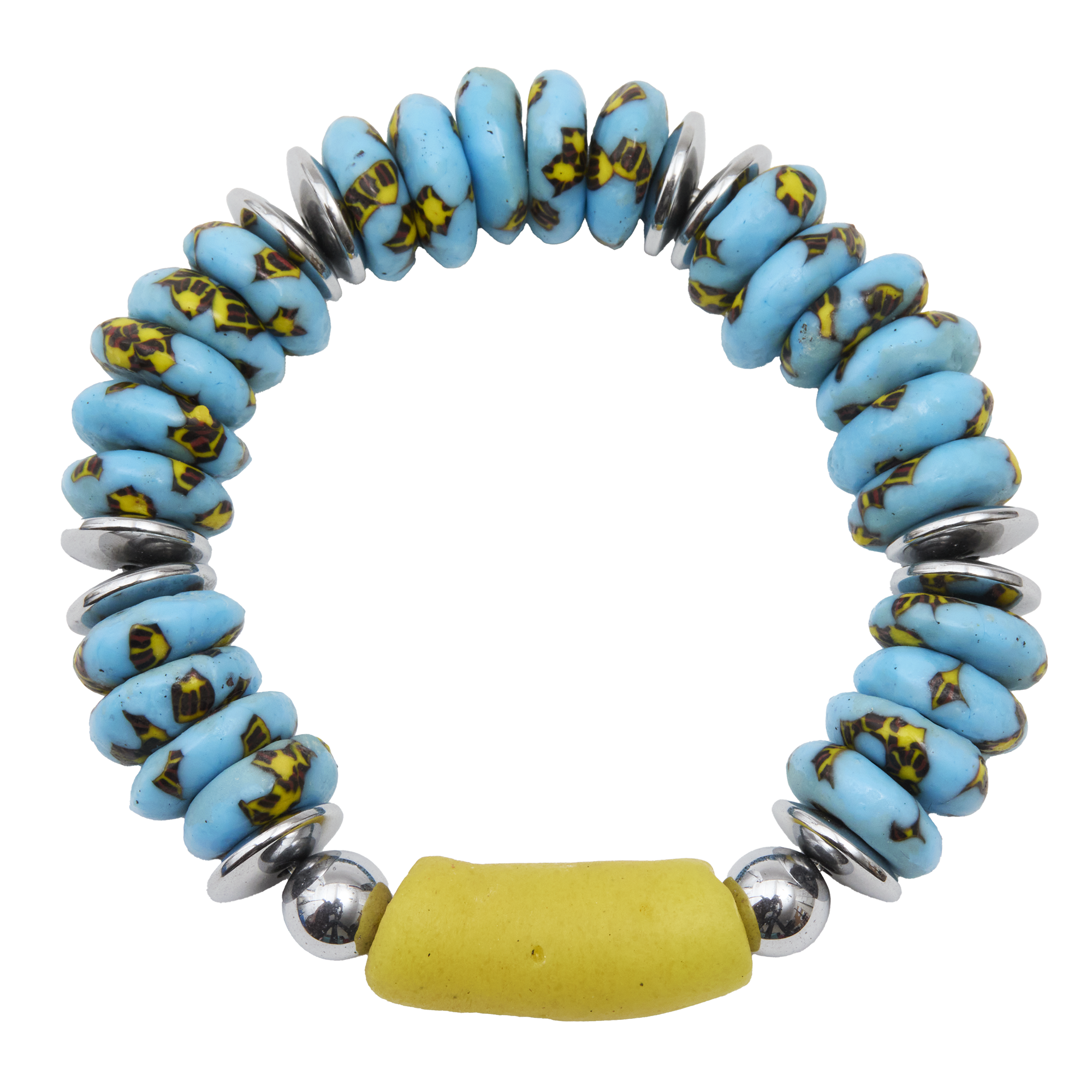 The Kiyah Bracelet is playful, vibrant, and full of personality. Bright blue and yellow African recycled glass rondelle beads frame a bold yellow tube bead focal, accented with hematite for contrast and polish. A fun pop of color, Kiyah embodies the joyful spirit of Afro Luxe.
