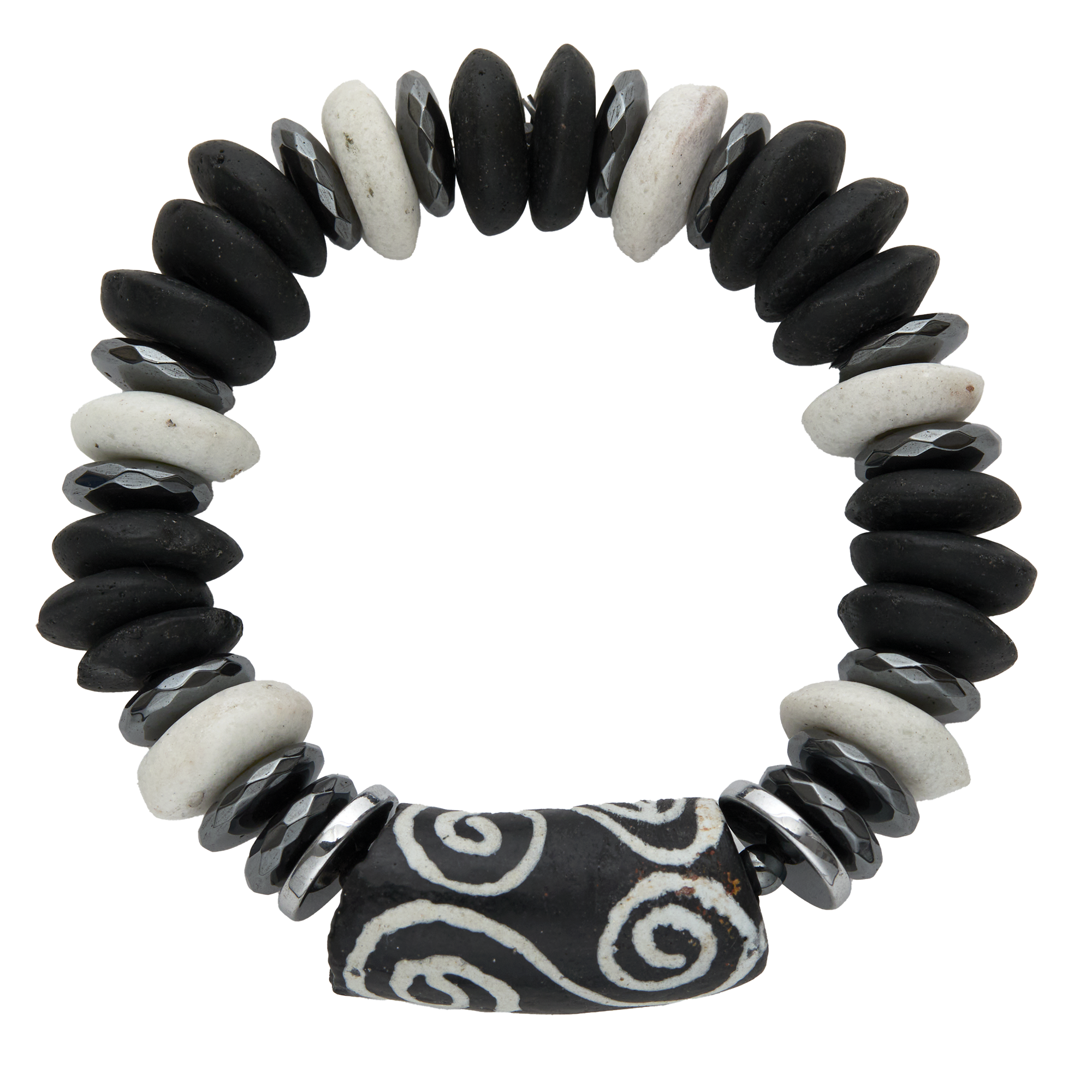 The Kwame bracelet is substantial, powerful, and full of presence. A bold black-and-white Krobo bead focal is paired with Ashanti beads in the same palette, accented with hematite for depth and balance. Striking and refined, Kwame carries strength in every detail.