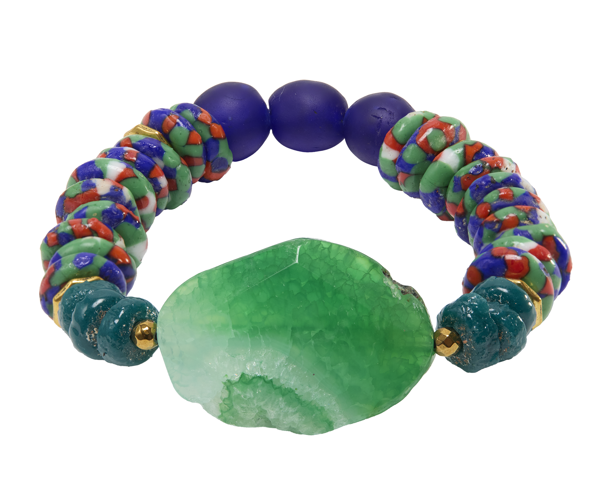 The Malika Bracelet is vibrant, colorful, and full of richness. A striking green agate focal bead is surrounded by African recycled glass in blues, greens, white, and red, creating a design that feels both bold and artful. Distinctive and joyful, Malika is made to inspire awe.