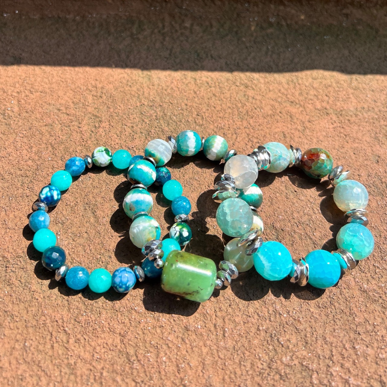 The Mixed Blue Triple Stack offers a unique combination of dyed Tibetan agate, dyed agate and dyed jade in elegant shades of blue, additionally adorned with hematite spacer beads and a chrysoprase focal. Perfectly combined to create an exclusive fashion accessory, this one-of-a-kind stack of stretch bracelets radiates luxury and sophistication. Adorn your wrist with all three bracelets together or wear them individually. Experience luxurious style and feel inspired with this stunning stack!