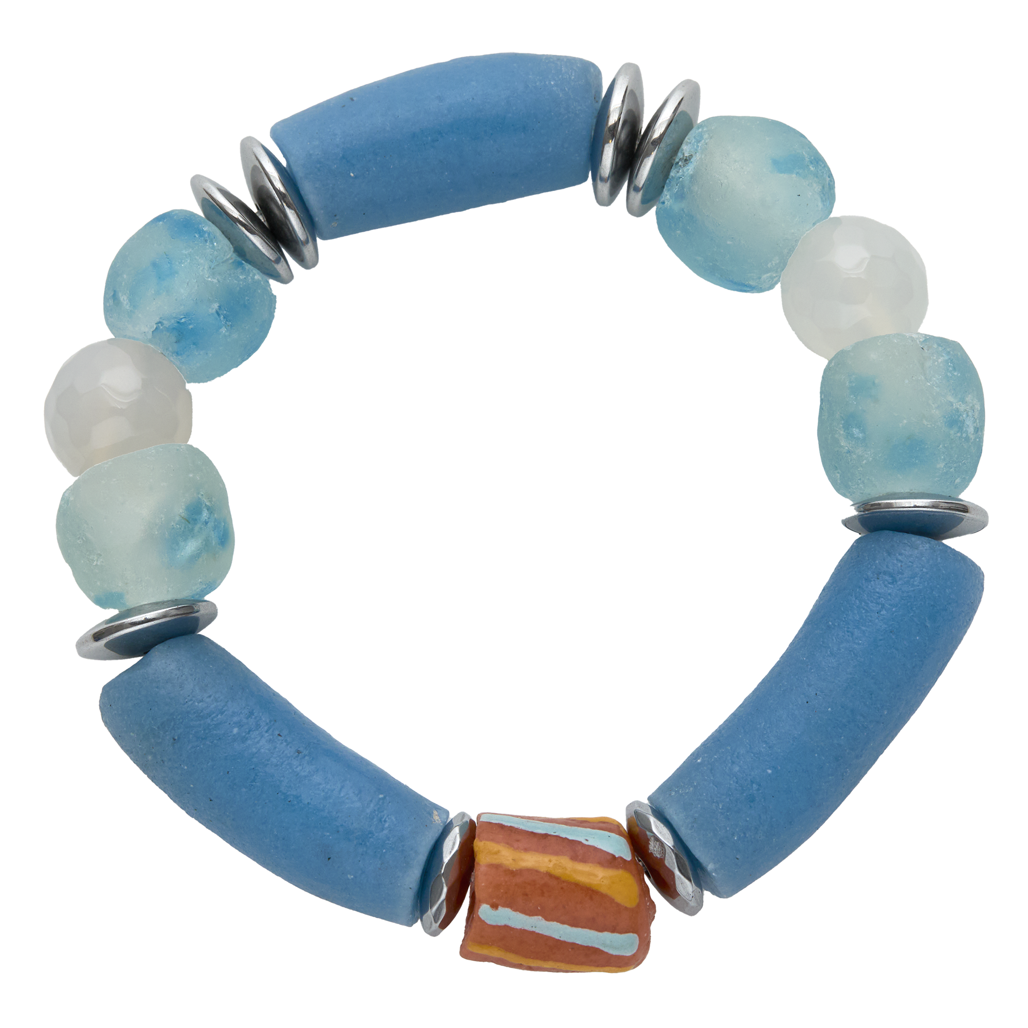 The Oma bracelet is cheerful, colorful, and full of life. Blue, white, and orange African recycled glass beads are accented with hematite for a polished finish. Vibrant yet easy to wear, Oma brings joyful energy to your everyday style.