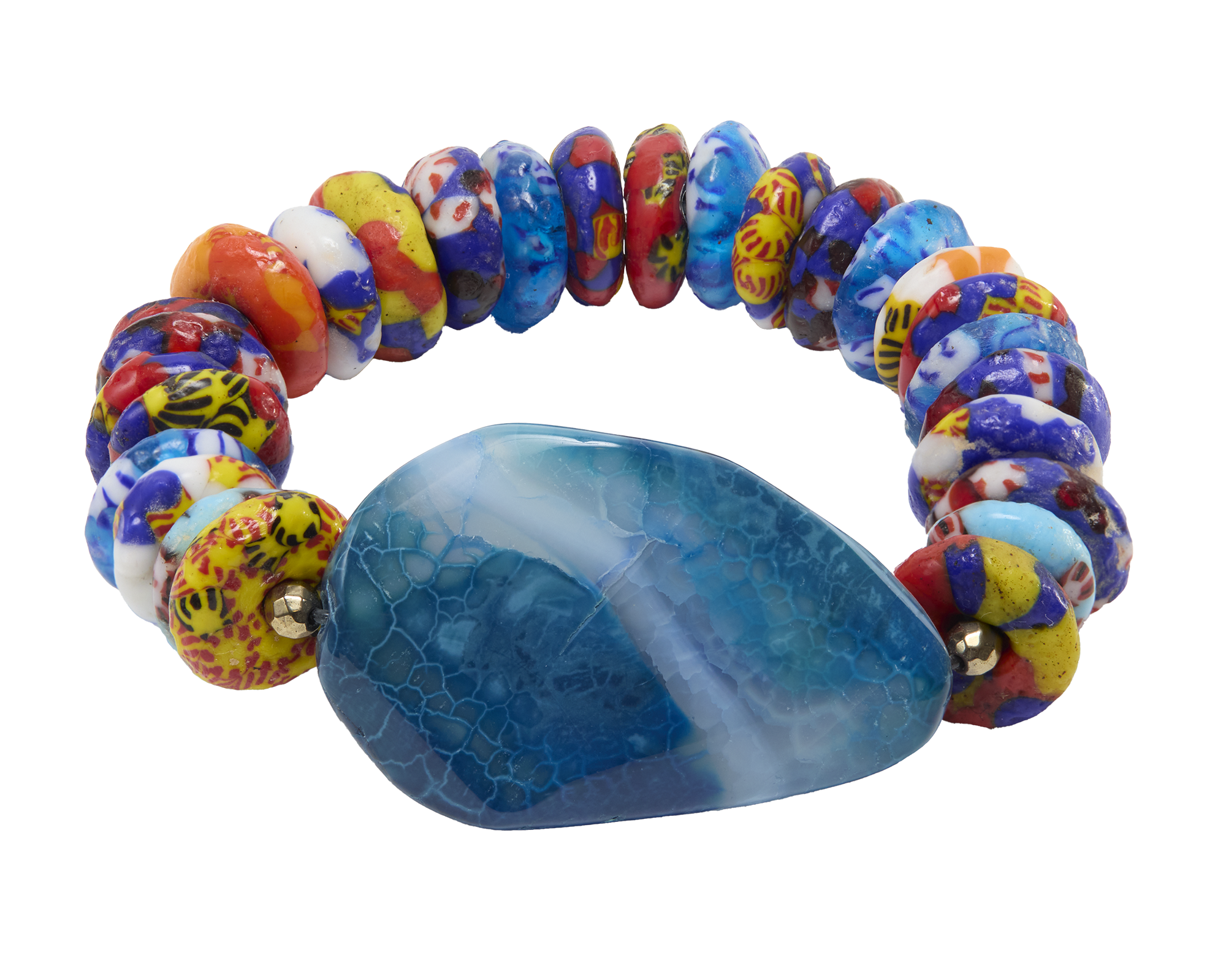 The Rashad bracelet is bright, bold, and exceptional. A unique blue agate focal anchors multicolor African recycled glass fused rondelle beads, blending vibrant energy with a grounding presence. Striking and full of character, Rashad makes an unforgettable statement.