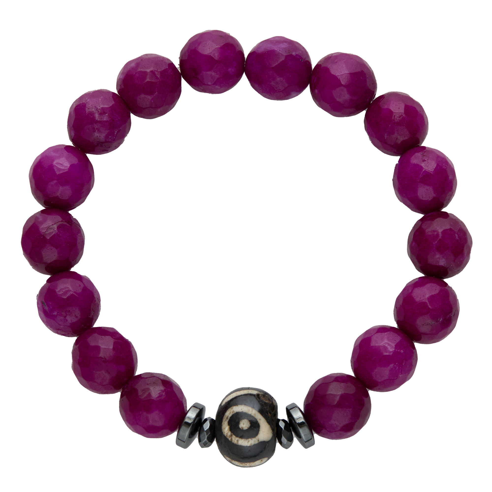 The Tara bracelet is vibrant yet grounded, with just the right mix of bold and subtle. Dark magenta dyed jade beads frame a smooth bone focal, accented with hematite for a polished finish. Easy to wear and full of charm, Tara brings quiet confidence to everyday style.