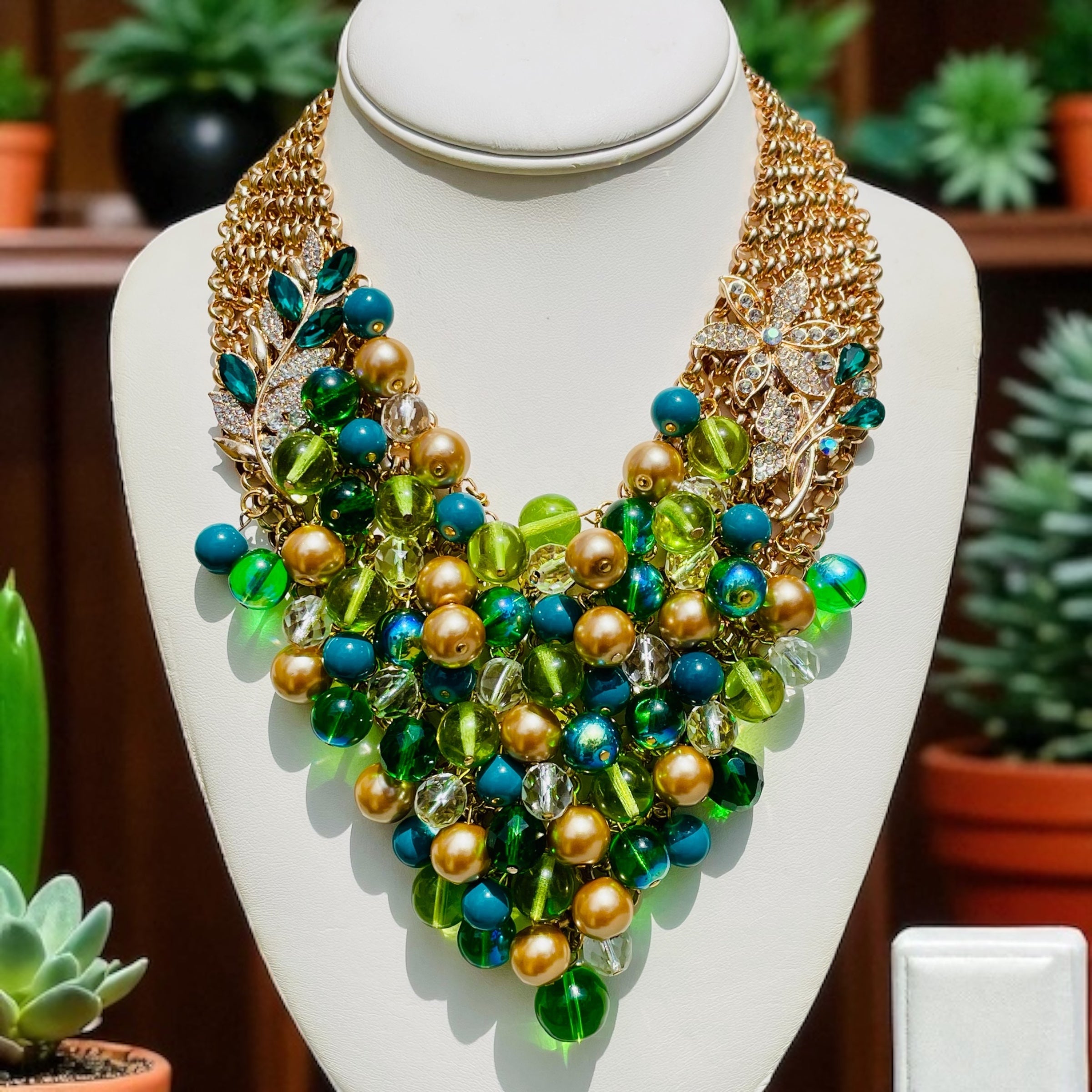 Unleash your inner fashionista with our vibrant Green and Teal Flower Bib Beaded Statement Necklace. This stunning piece features an exquisite blend of rich green and vibrant teal beads, artfully arranged to form a floral design that captures the essence of nature’s beauty.