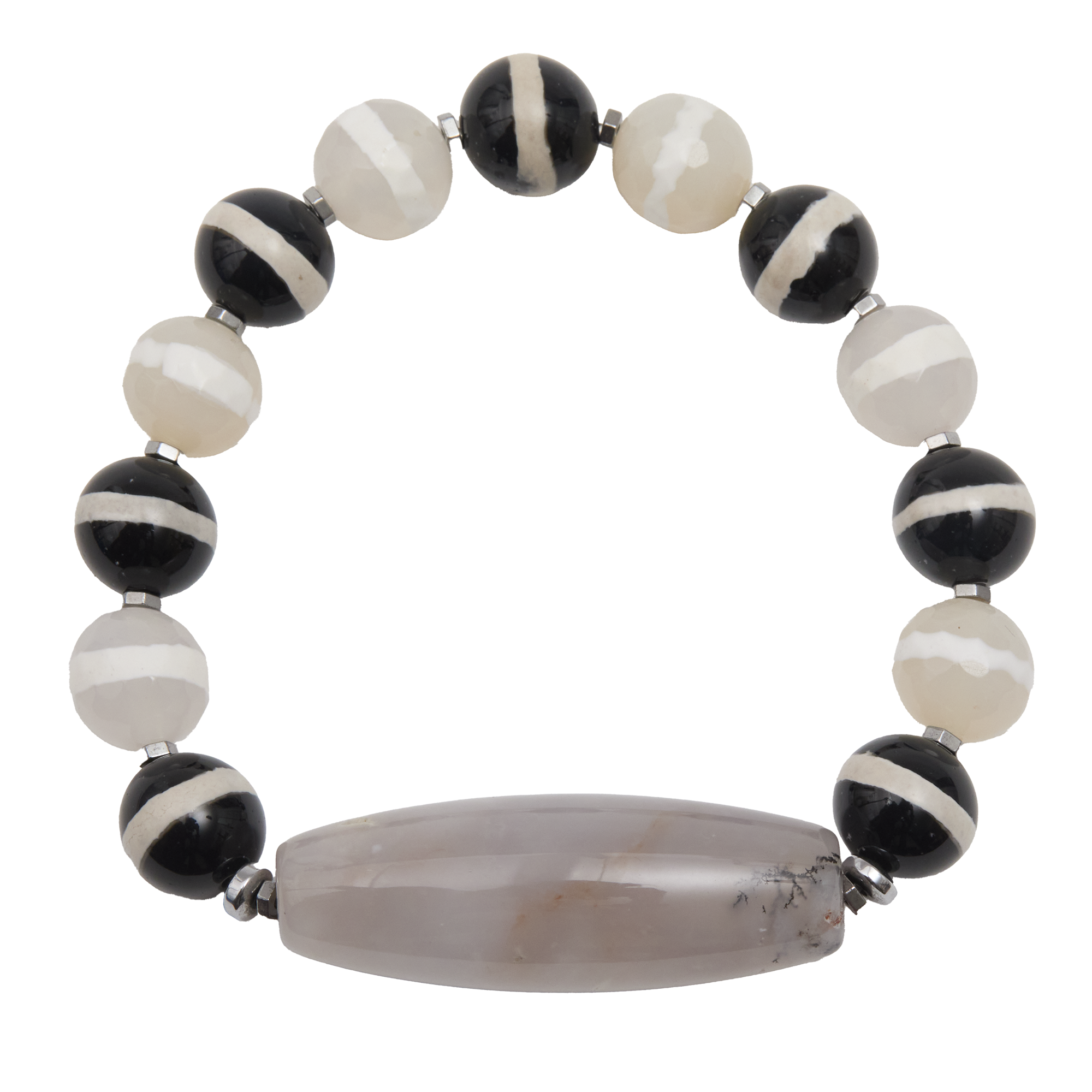 The Greyson bracelet is sleek, neutral, and quietly bold. Black-and-white Tibetan agate beads mix with mixed white Tibetan agate for subtle contrast, all centered by a greyish-white agate focal. Balanced and versatile, Greyson brings depth to any look without overpowering.