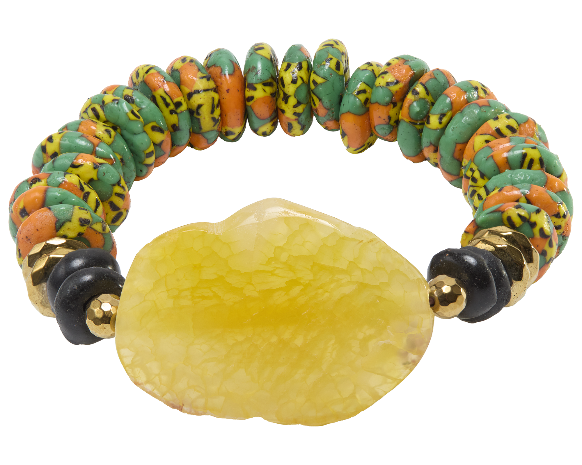 The Makeba bracelet is bright, bold, and audacious by design. A striking yellow agate focal is paired with African recycled glass rondelle beads patterned in green, orange, and yellow, accented with hematite for depth. Colorful and unapologetic, Makeba is made to stand out.