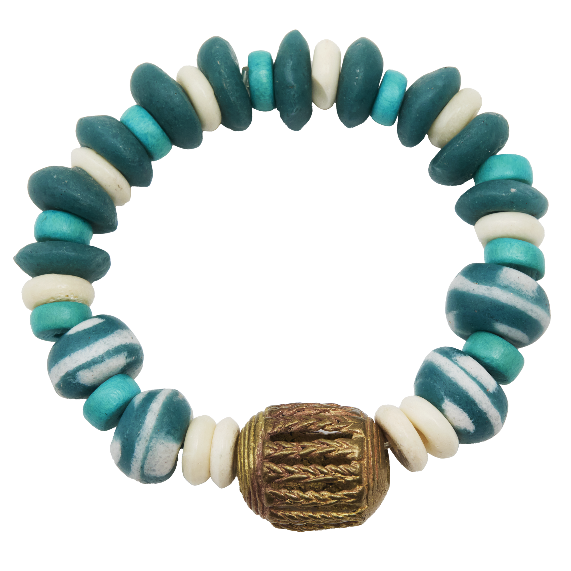 The Adiola Bracelet is luxurious and full of intrigue. A bold brass focal anchors a mix of teal Ashanti, teal wood, bone, and African recycled glass beads for a look that’s rich in texture and story. Striking yet refined, Adiola embodies the bold elegance of Afro Luxe.