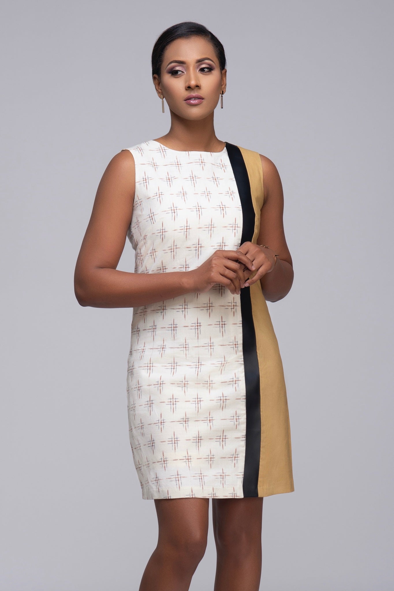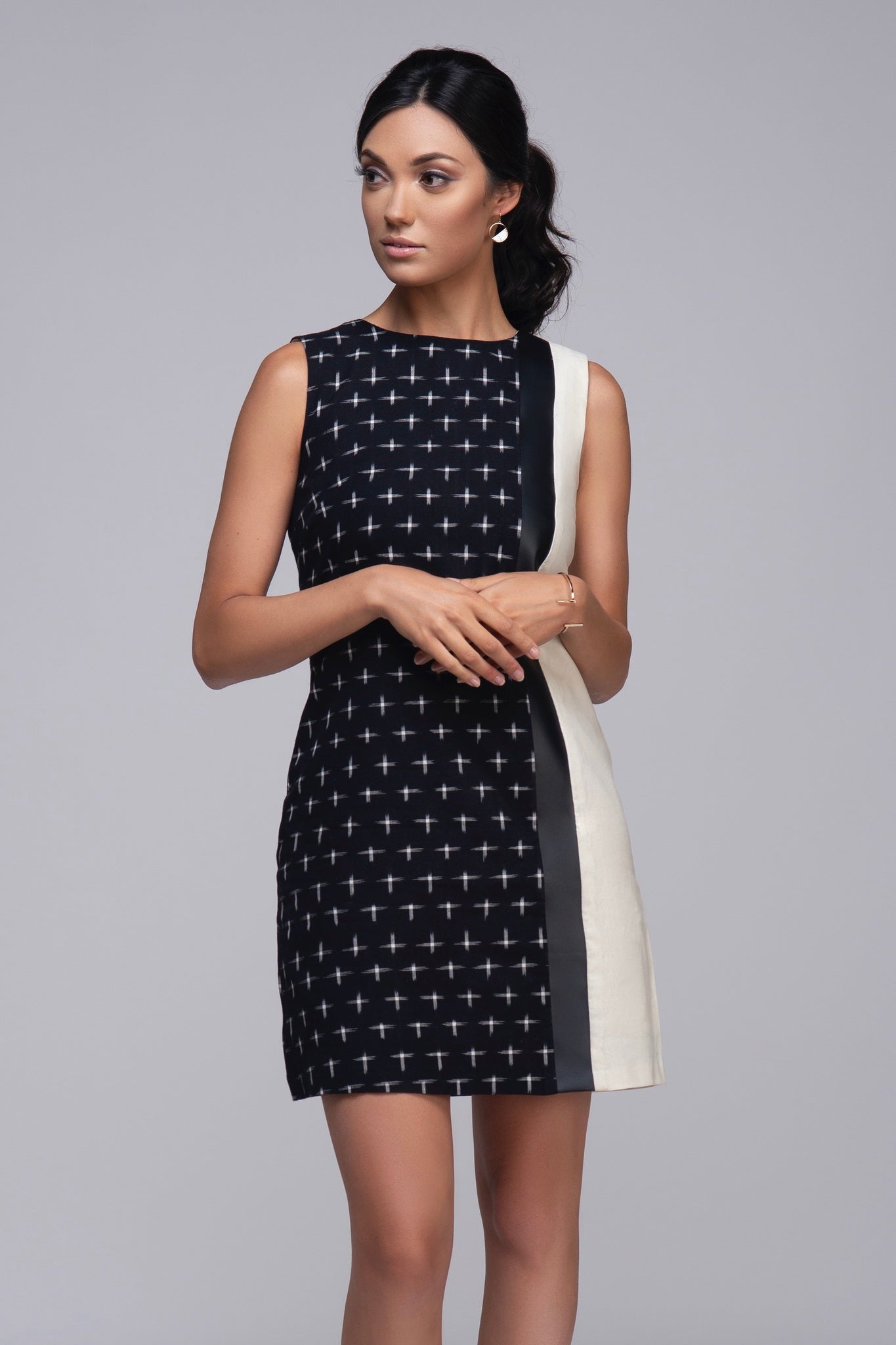 Sleek and elegant, we crafted the 'Alina' to be a staple in your wardrobe. Marrying printed ikat and solid fabrics with a faux leather strip, this color block dress creates visual interest with its simple sophistication. Great for wearing in the office, on dinner dates, or over cocktails.