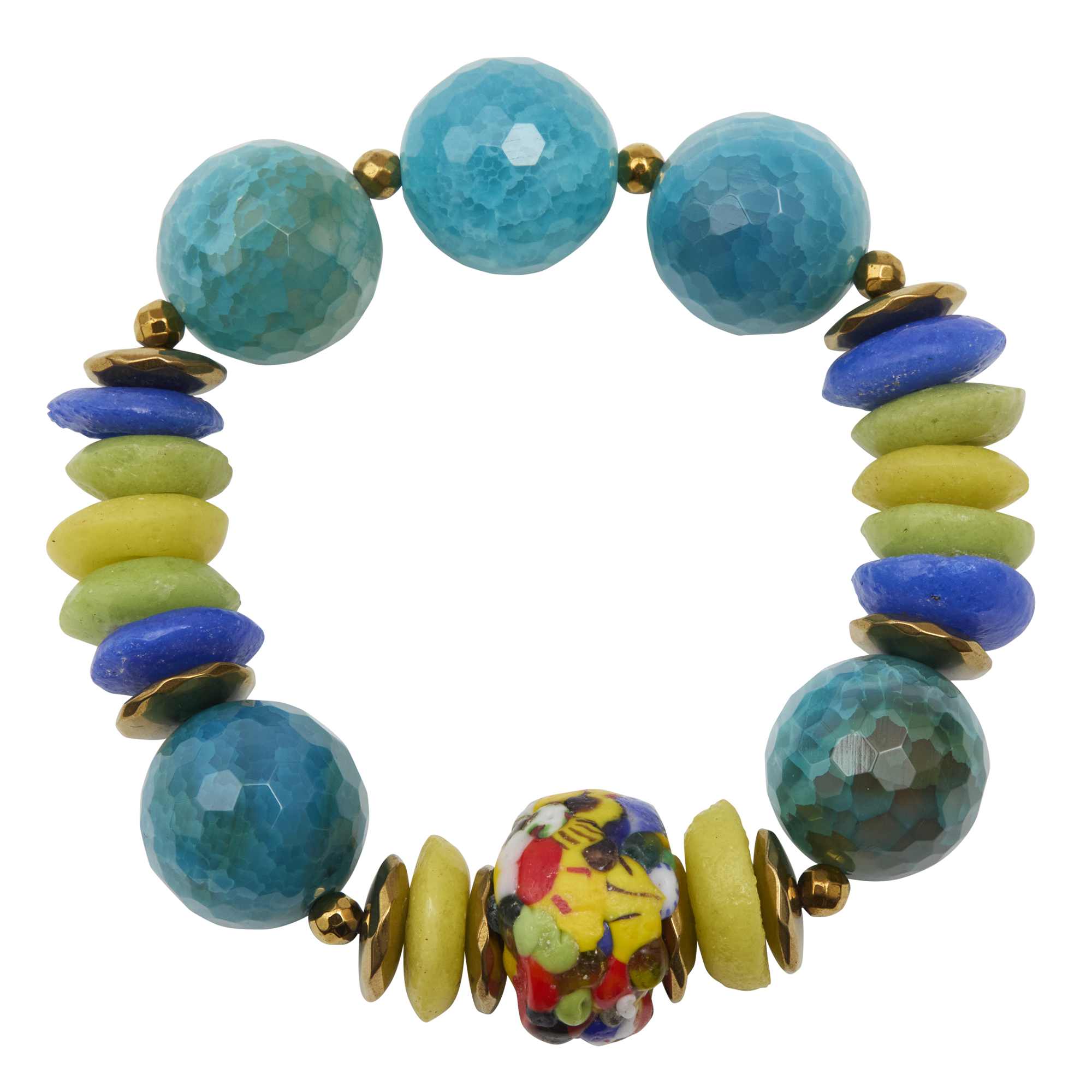 The Asha Bracelet is bold, joyful, and full of life. Large faceted blue agate beads pair with hematite accents, vibrant Ashanti beads in blue, yellow, and green, and a striking fused seed bead focal. A true statement piece, Asha radiates Afro Luxe energy with every detail.