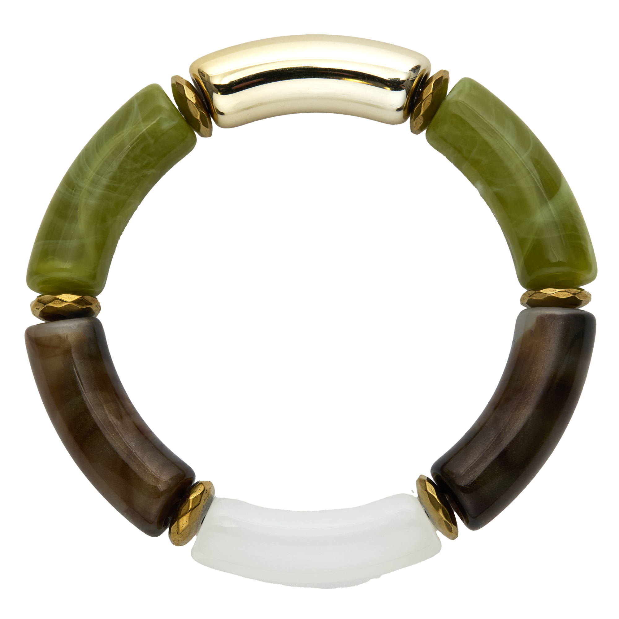 The Camille Bracelet is classic, clean, and made for effortless styling. White, olive green, gold, and brown acrylic tube beads are accented with hematite for a subtle touch of shine. Lightweight and stackable, Camille brings everyday polish with ease.