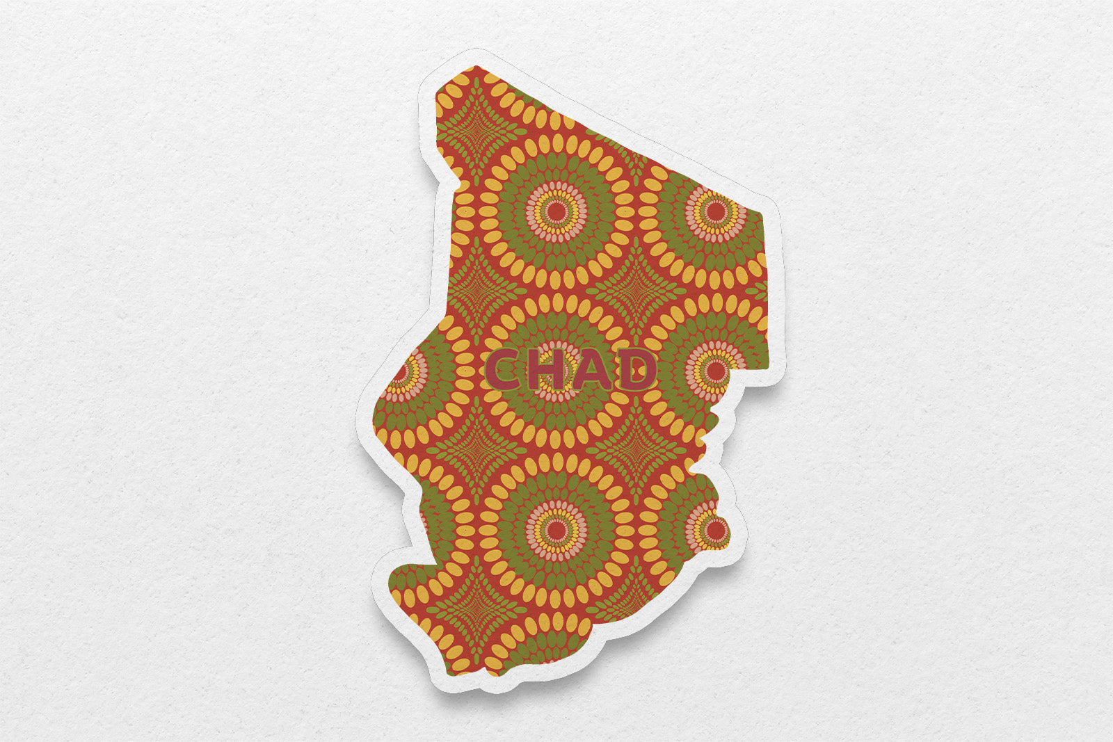 Show your love for Chad with this durable and delightful waterproof vinyl sticker! Featuring a vibrant outline of the country and an original Ankara inspired patter, this sticker adds a touch of international flair to your laptop, water bottle, or notebook. Crafted from high-quality vinyl, it's built to withstand the elements, from unexpected rain showers to the daily grind. Whether you're a proud Chadian, an avid traveler, or simply appreciate unique designs, this sticker is a fantastic way to showcase your personality with a touch of global charm. Stick it anywhere and let your Chad pride shine!