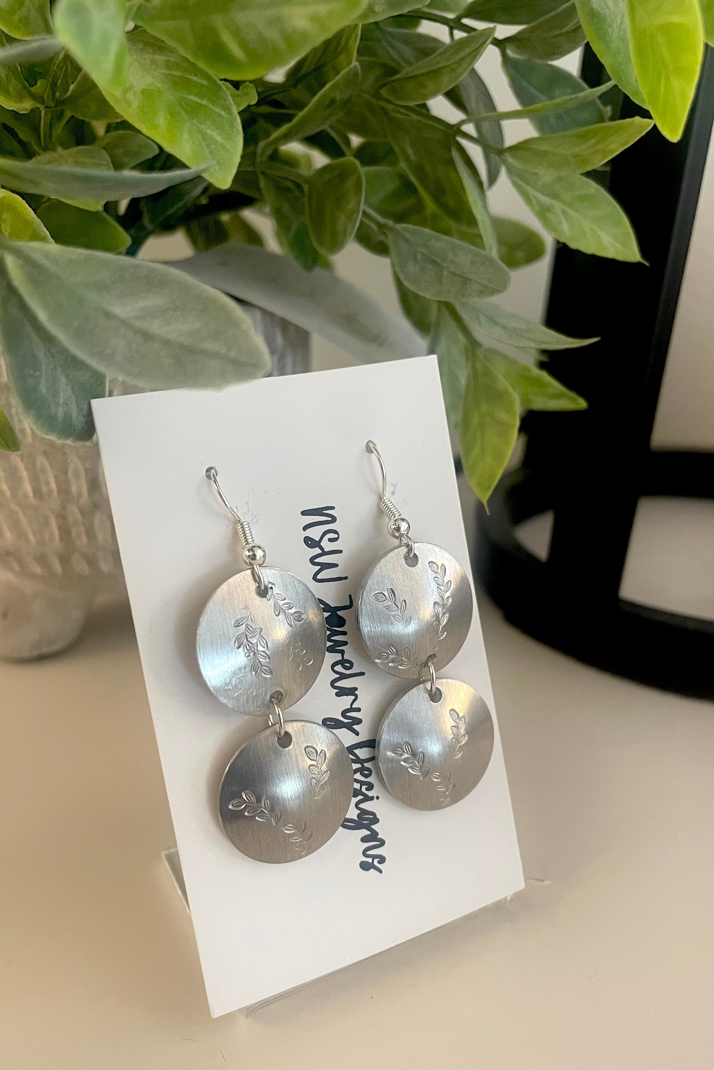 Simply beautiful, these handcrafted aluminum earrings feature double rounds stamped with lovely ferns.